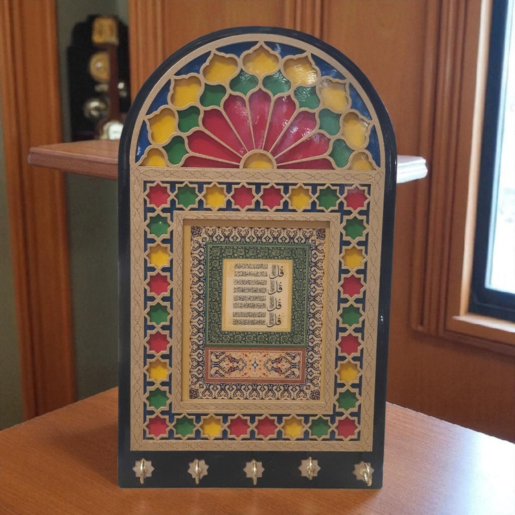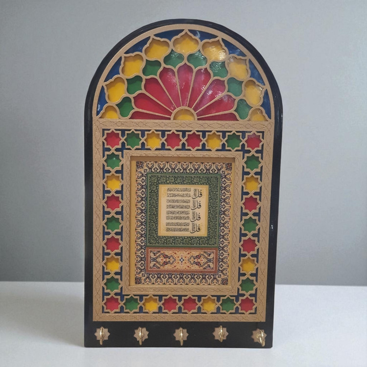 <p>طرح پنج‌دری الهام‌گرفته از پنجره‌های سنتی خانه‌های قدیمی با شیشه‌های رنگی است که فضایی گرم و صمیمی ایجاد می‌کند. در مرکز این جاکلیدی، آیات چهارقل با خطی زیبا نوشته شده‌اند که در فرهنگ اسلامی به عنوان حرز و محافظ در برابر بلا و چشم‌زخم شناخته می‌شوند.</p>
