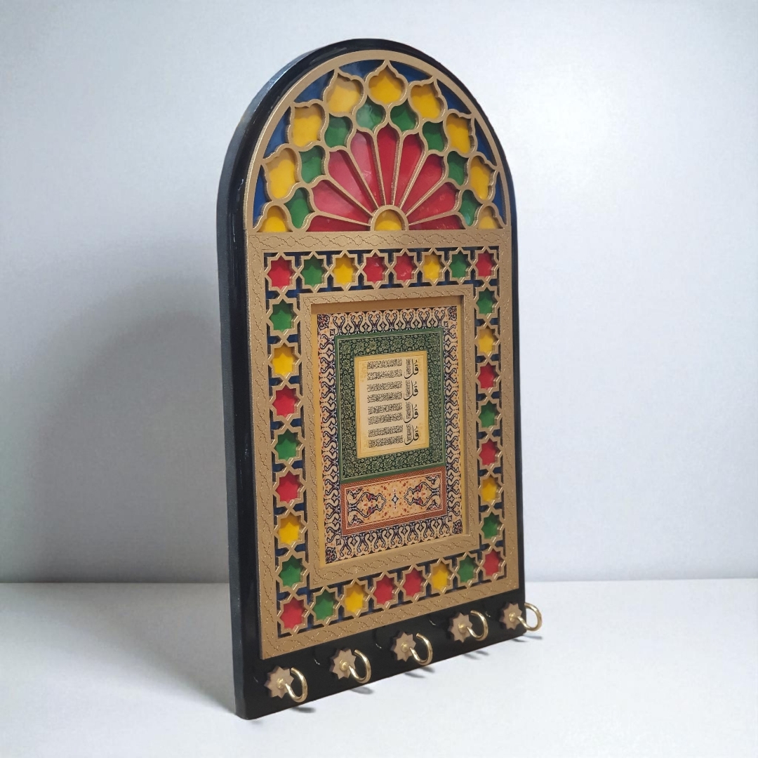 <p>طرح پنج‌دری الهام‌گرفته از پنجره‌های سنتی خانه‌های قدیمی با شیشه‌های رنگی است که فضایی گرم و صمیمی ایجاد می‌کند. در مرکز این جاکلیدی، آیات چهارقل با خطی زیبا نوشته شده‌اند که در فرهنگ اسلامی به عنوان حرز و محافظ در برابر بلا و چشم‌زخم شناخته می‌شوند.</p>