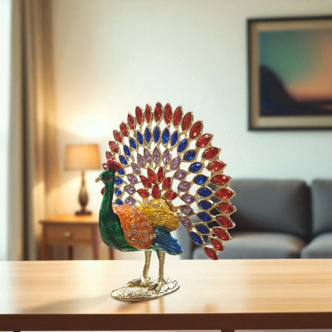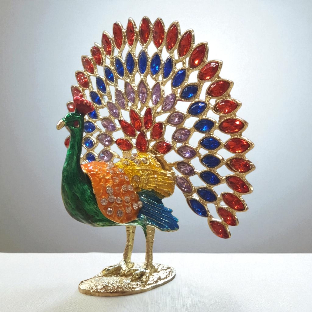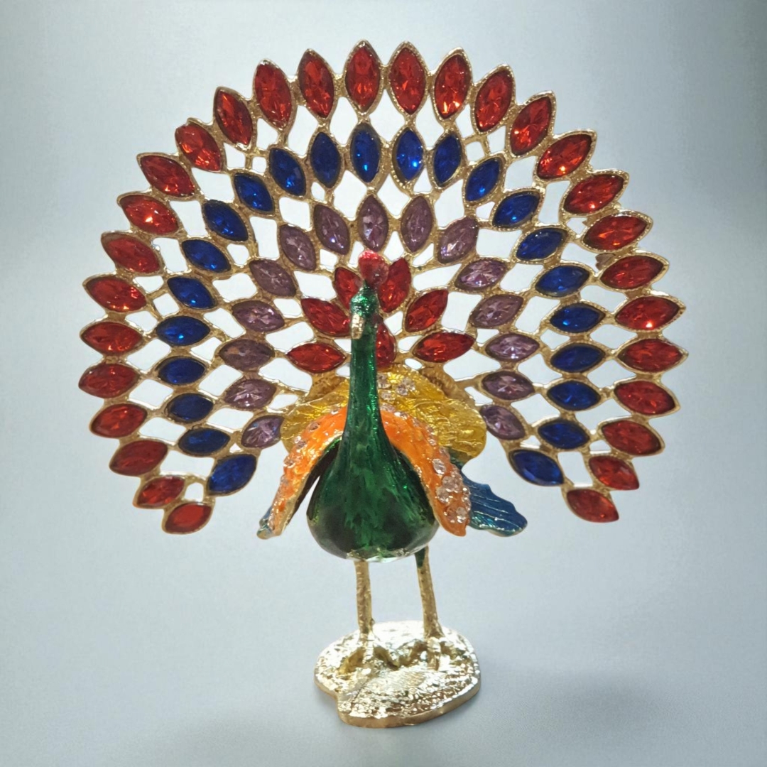 نگینهای بنفش، قرمز و آبی روی پرهای طاووس، جلوهای درخشان به آن بخشیده و باعث شده به یک دکوری شیک برای منزل یا هدیهای ارزشمند تبدیل شود.