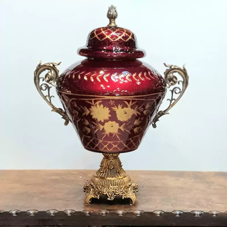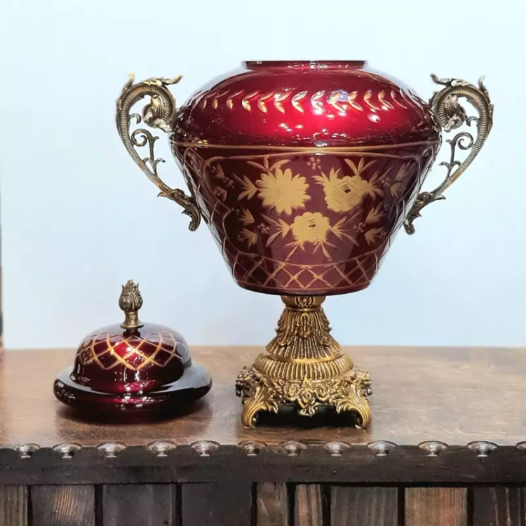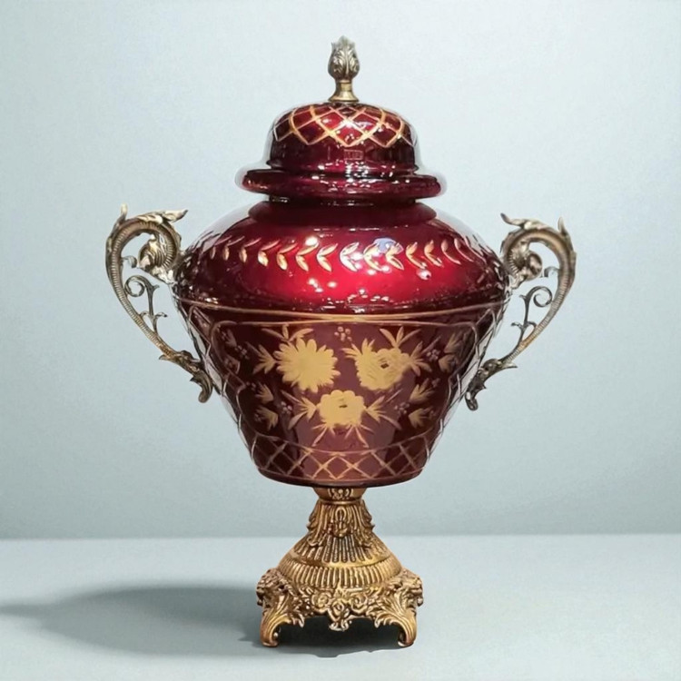 کاپ در دار بلور تراش خورده ، دو پوست ، قرمز رنگ ، دسته و پایه فلز آبکاری شده
