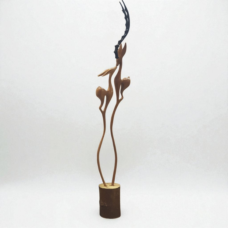 هر کدام از غزالها بهطور کامل از یک تکه چوب روس تراشیده شدهاند و روی یک کندهی چوبی طبیعی قرار دارند. طراحی این مدل خاصتر از حالت کلاسیک است؛ در این نمونه پاهای هر غزال بهصورت دو پا تراش خوردهاند که در پایین به یک پایهی واحد تبدیل میشوند — سبکی مدرن و هنری که جلوهای متفاوت ایجاد میکند.