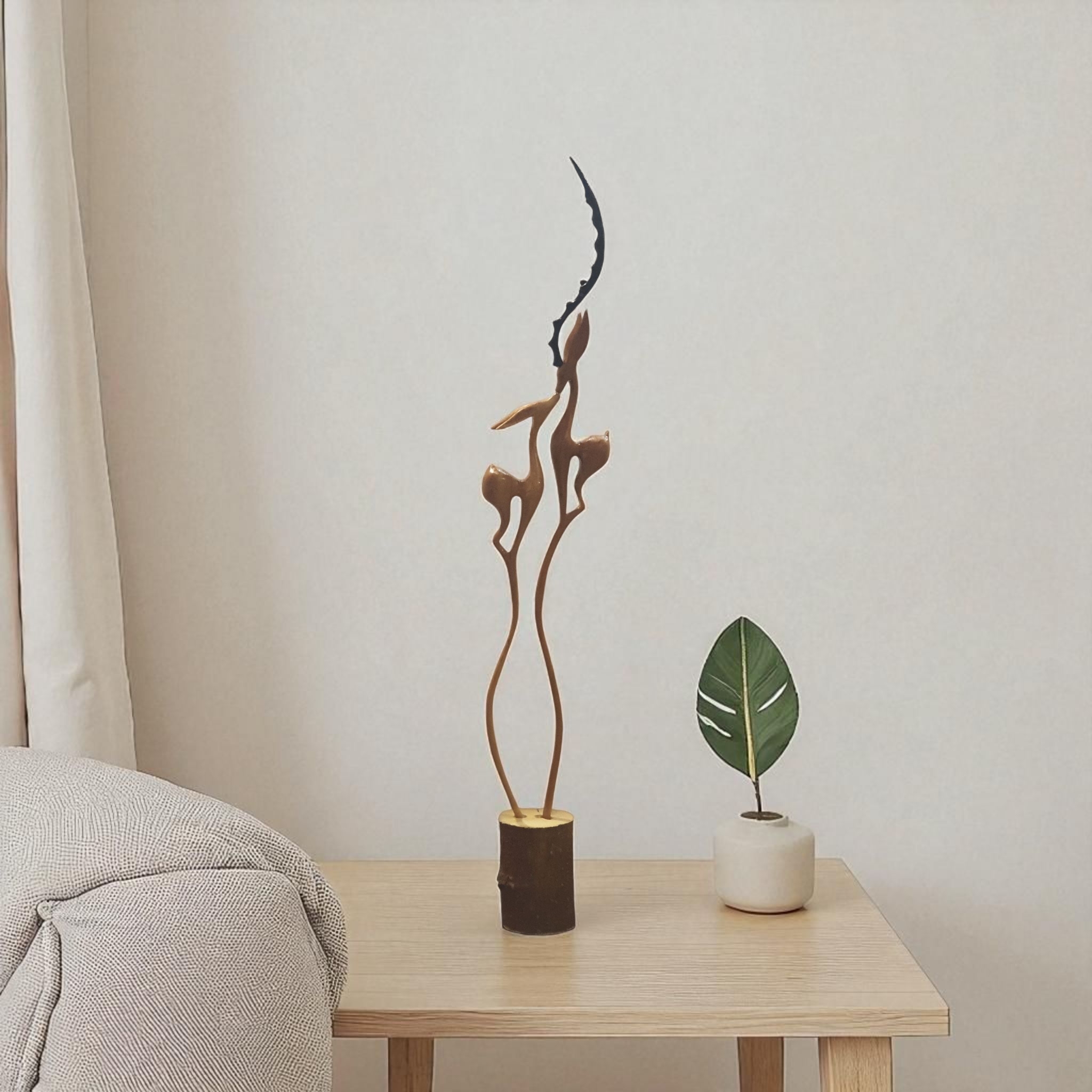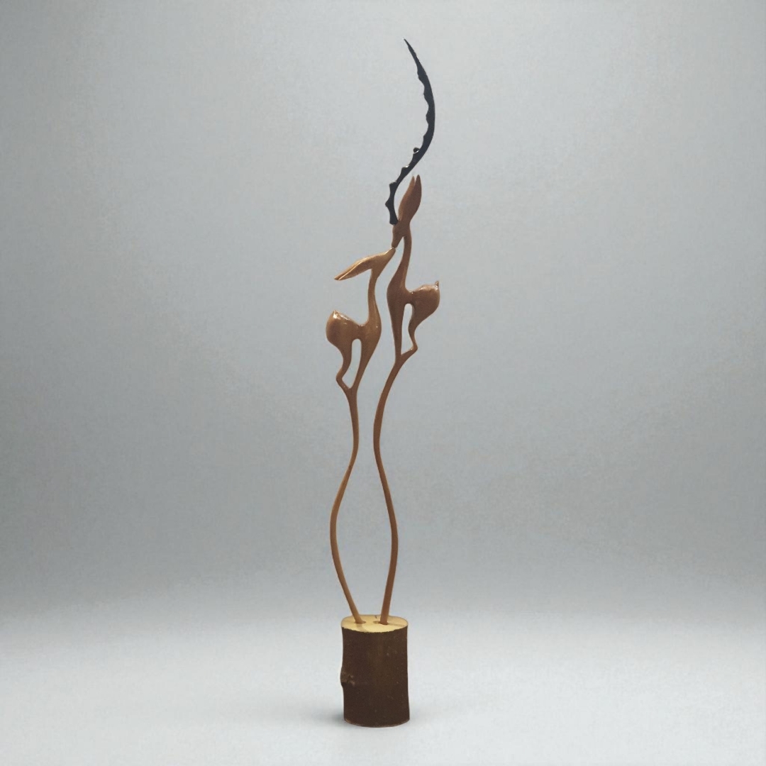 هر کدام از غزالها بهطور کامل از یک تکه چوب روس تراشیده شدهاند و روی یک کندهی چوبی طبیعی قرار دارند. طراحی این مدل خاصتر از حالت کلاسیک است؛ در این نمونه پاهای هر غزال بهصورت دو پا تراش خوردهاند که در پایین به یک پایهی واحد تبدیل میشوند — سبکی مدرن و هنری که جلوهای متفاوت ایجاد میکند.