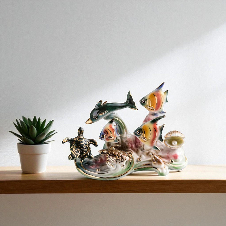 این مجسمهی دریایی زیبا ترکیبی شگفتانگیز از دلفین، ماهیهای رنگارنگ، لاکپشت و صدف مروارید است که همگی روی موجی از دریا طراحی شدهاند. ظرافت در رنگآمیزی و استفاده از جزئیات طلایی، این اثر را به یک تکه هنری خاص برای دکوراسیون منزل یا محل کار تبدیل کرده است. طراحی سهبعدی و زندهی این مجسمه باعث میشود هر بار نگاه کردن به آن حس آرامش و انرژی مثبت دریا را تجربه کنید.
