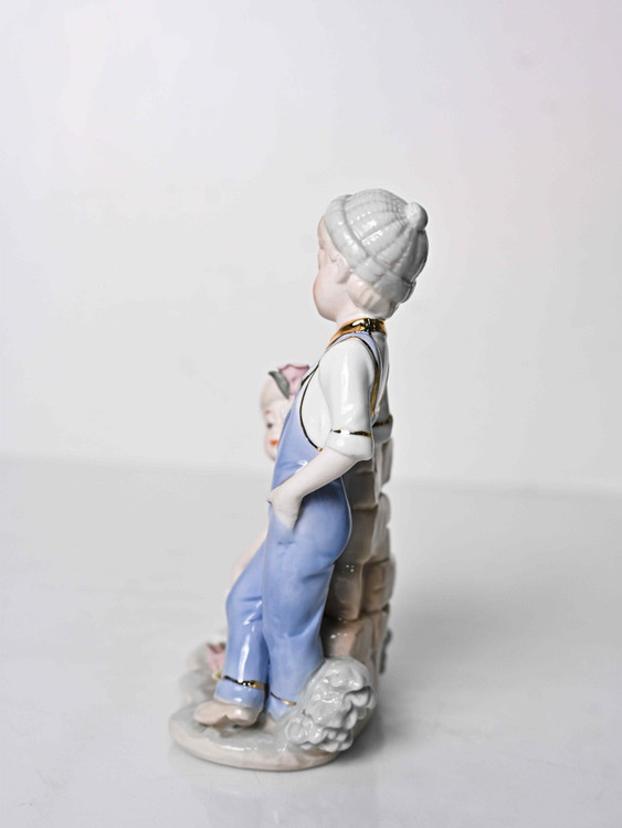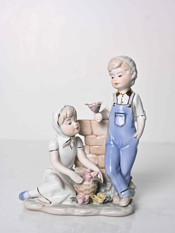این مجسمهی چینی دوستداشتنی، تصویر زیبایی از عشق پاک و نوجوانانه را در فضایی شبیه باغی کوچک با سنگها و گلهای ظریف به نمایش میگذارد. پسر با پوشش کلاسیک انگلیسی شامل شلوار و ساسبند و دختر با پیراهنی دلنشین و روسری، ترکیبی گرم، صمیمی و نوستالژیک ایجاد کردهاند.