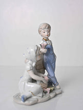 این مجسمهی چینی دوستداشتنی، تصویر زیبایی از عشق پاک و نوجوانانه را در فضایی شبیه باغی کوچک با سنگها و گلهای ظریف به نمایش میگذارد. پسر با پوشش کلاسیک انگلیسی شامل شلوار و ساسبند و دختر با پیراهنی دلنشین و روسری، ترکیبی گرم، صمیمی و نوستالژیک ایجاد کردهاند.