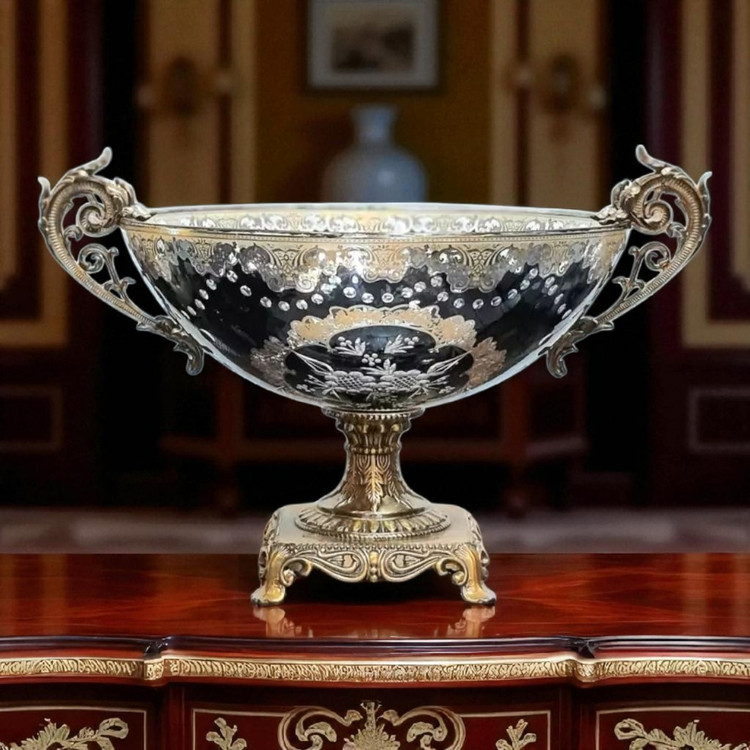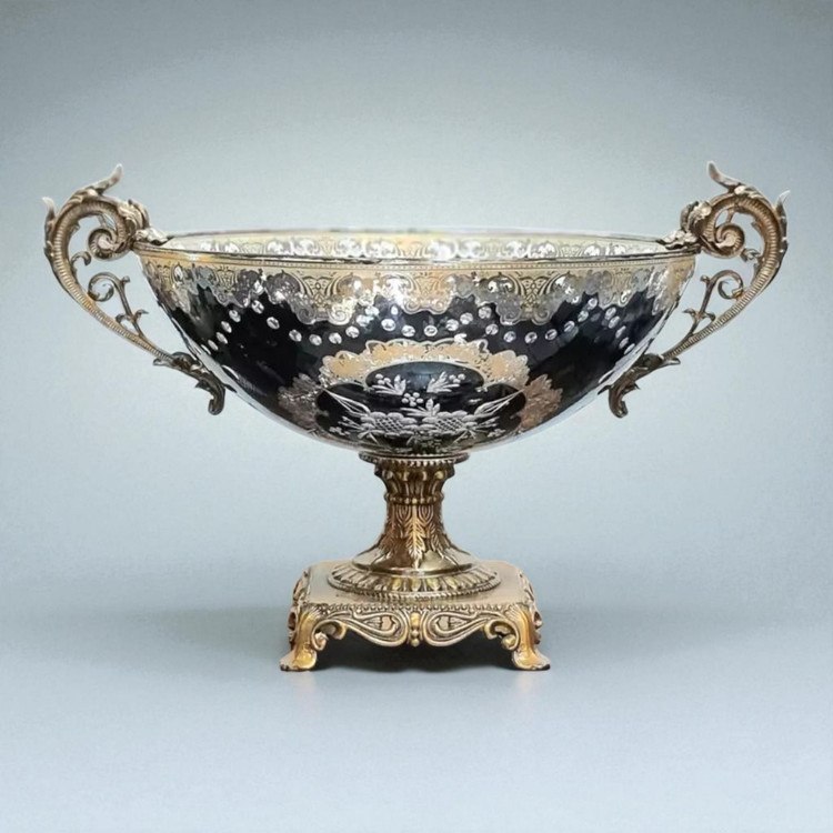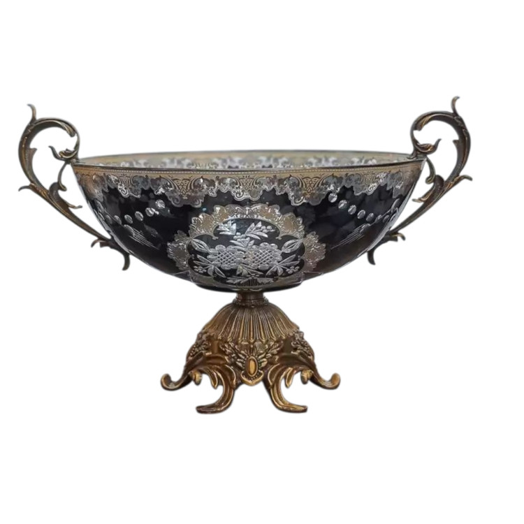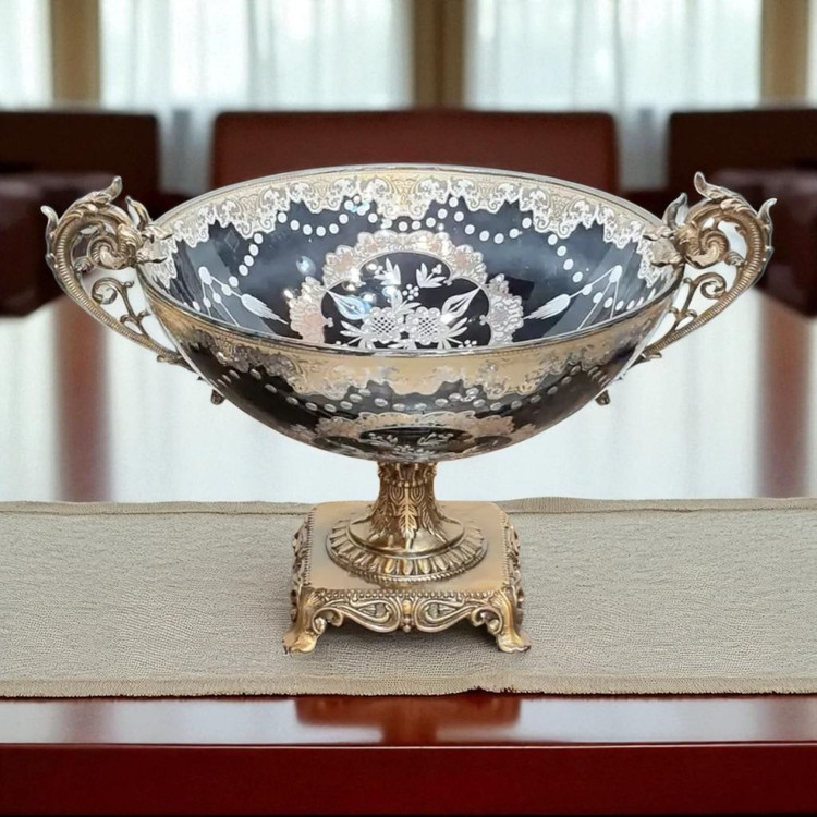میوه خوری بزرگ بلور مشکی رنگ ، تراش خورده و دارای آبکاری طلایی رنگ ، دسته و پایه فلز آبکاری شده ، محصول چین